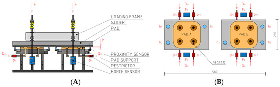 The experimental hydrostatic bearing device (Figure 2) consisted of two pads, a load frame and a hydraulic unit. The pad geometry was designed with four circular recesses. Each of the recesses had a restrictor of the type throttling valve before the inlet. The lubricating film thickness measurement () was provided by contactless inductive proximity sensors with a precision of ±0.01 mm and a range of 3 mm. The pressure in the recess () was measured with a precision of ±0.56 bar. The load () was applied by tightening four threaded rods, at the end of which a force sensor with a precision of ±0.003 kN was mounted, and the load can be applied up to 60 kN. The hydraulic unit was designed to supply a flow rate () of up to 10 L/min at a pressure of 100 bar. The flow rate was measured by a flow meter with a precision of ±0.2 L/min.