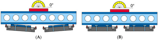 The tilt of the runner was measured in two axes with a precision spirit level. This spirit level had a magnetic seating surface, which ensured contact between the spirit level and the straightedge. The precision of the spirit level equated to 0.02 /. The first part of the alignment consisted of leveling (Figure 3) the outer edges of the pads. This helped to simplify the whole measurement. Then, the remaining two inner edges of the pads had to be adjusted in height. The angle in the two axes was constantly monitored, along with the contact of the straightedge with the pad surface.