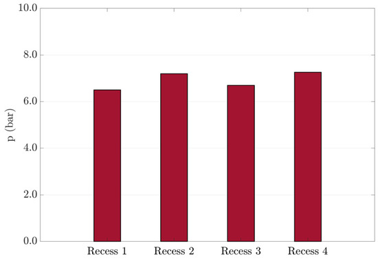 The second set of data is focused on pressures that are generally dependent on the carried load by the hydrostatic bearing. From this point of view, the pressure values were at the same level since the load was the same in all cases. However, compared to the analytical prediction (9.6 bar line), there is a significant difference. The fact that the prediction does not consider inputs other than force, pressure coefficient, and bearing area may play a major role. Effects such as the type of restrictor used and manufacturing tolerances are not included at all. In addition, the biggest influence on the error rate in the pressure prediction calculation comes from reading the pressure coefficient from the graph.