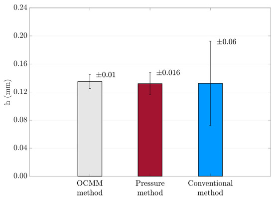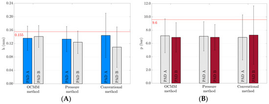 The average lubricating film thickness and average recess pressure were evaluated for each series of measurements using a particular method (Figure 6). The first series of results showed a comparison of pad A and pad B relative to the reference value (red line). In all cases, the error intervals are taken as the cumulative error of the measurement, sensing, and data logging. The OCMM method was able to achieve thicknesses of 0.136 and 0.141 . Such bearing film thicknesses agreed with the predicted thickness value of 0.155 . The deviation was due to manufacturing inaccuracies of the pocket and slider, which were not included in the analytical prediction of the ideal condition. Further, the pressure method set the bearing to a lubricating film thickness of 0.133 and 0.128 . From a safety point of view, the bearing is at a lower lubricating film thickness but still in agreement with the prediction. In contrast, the method using conventional measuring devices had the largest variation in lubricating film thickness. Despite the relatively high thickness value of 0.144 , the bearing had the worst thickness distribution between the pads. Pad B was more heavily loaded, resulting in a low average thickness value of 0.109 due to unsuitable load distribution.
