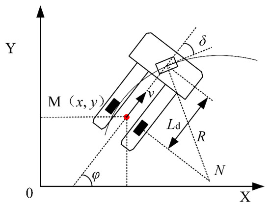 Based on Figure 1, the kinematic equations of the forklift AGV can be obtained: