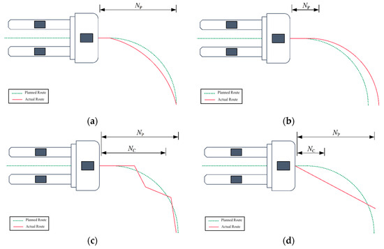 The prediction horizon NP and control horizon NC are crucial parameters affecting control accuracy and stability. Selecting appropriate prediction and control horizons can significantly enhance path tracking quality [20]. As depicted in Figure 2a, a larger prediction horizon enabled the controller to predict motion states over a longer distance. However, larger tracking errors nearby may accumulate over time, leading to gradually increasing deviations. In contrast, a shorter prediction horizon offers advantages in real-time tracking but reduces the prediction length. Under constraints on the control increment of the front wheel steering angle, as illustrated in Figure 2b, the forklift AGV may fail to steer promptly.