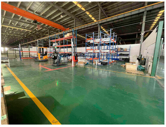 To validate the feasibility and effectiveness of the velocity-adaptive MPC-based path tracking method for heavy-duty forklift AGVs, field experiments were carried out in a warehouse environment (Figure 3) using a heavy-duty forklift AGV developed by Zhongcang Robot (Nanjing) Co., Ltd. (Figure 4).