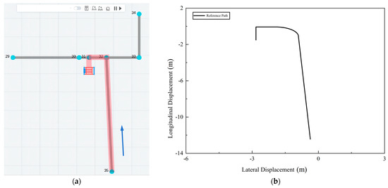 The experiment was designed to include a comprehensive path consisting of straight sections, curved sections, and loading/unloading segments. Considering the obstacles in the experimental site, Node 31 (pallet) was set as the target node, and Node 35 (coordinates (−3.6, −12.4)) was set as the starting node in Figure 5a. The initial heading angle was π/2, and the path direction was indicated by the blue arrows. Figure 5b shows the complete experimental reference path planned after selecting the nodes.