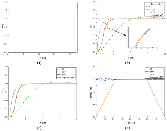 First, the straight-line condition of the heavy-duty forklift AGV was simulated and verified, representing the most common scenario in actual operation. As shown in Figure 6a, the straight segment started at position (0, 0) with an initial heading angle of 0 and an initial velocity of 0.1 m/s. As illustrated in Figure 6b, the LQR algorithm initially tracked the reference path, while the pure tracking algorithm lagged, exhibiting significant path oscillation. Both the improved algorithm and the original MPC algorithm exhibited a consistent overall tracking trend, with the improved algorithm slightly ahead of the original MPC algorithm in reaching the target path.