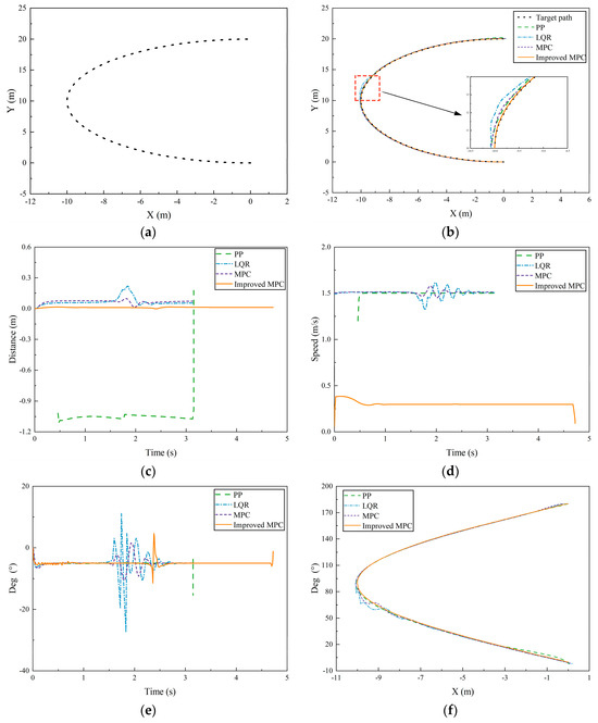 The tracked paths for the steering condition are shown in Figure 7b. Initially, there was minimal deviation among the tracking paths of the various algorithms, but as they moved toward the midpoint, the differences increased. Zooming in on the curve at this midpoint revealed that the tracking curve of the improved MPC algorithm closely aligned with the reference curve, followed by the pure tracking algorithm, the MPC algorithm, and the LQR algorithm, respectively. This consistency with the lateral deviation curves of the four algorithms in Figure 7 indicated that the improved MPC algorithm had the smallest lateral deviation, significantly differing from the other algorithms.