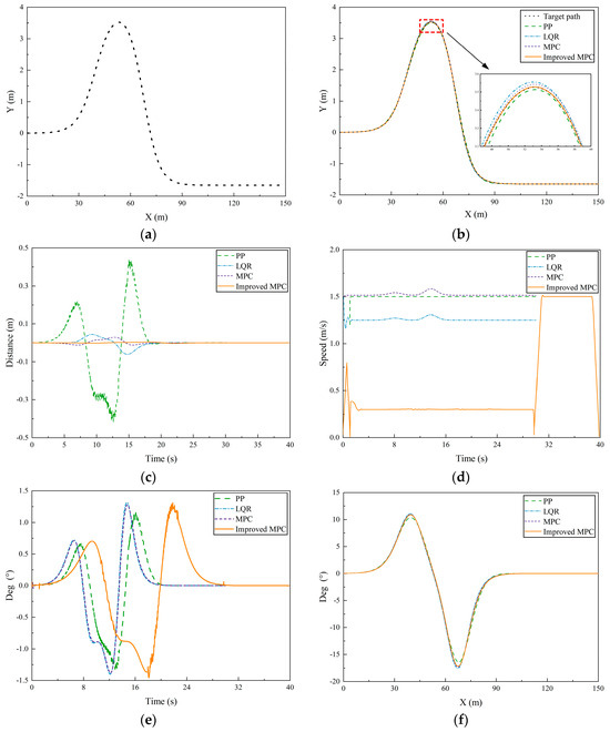 Figure 8a shows the double lane change reference path, which includes both straight and curved segments. Different path tracking algorithms were simulated under the double lane change condition. All algorithms performed well on straight segments, but errors were more pronounced on curved parts. Zooming in on the paths at a lateral distance of 50 m revealed that the path generated by the pure tracking algorithm lay below the reference path, followed by the original MPC algorithm and the LQR algorithm. The path tracked by the improved MPC algorithm almost perfectly aligned with the reference path, indicating superior tracking performance, especially in regions with high curvature.