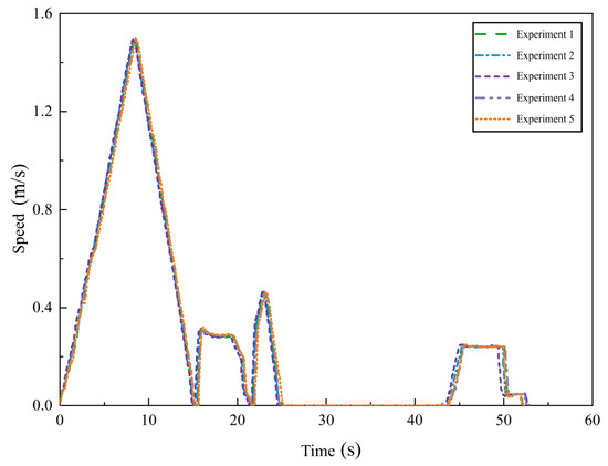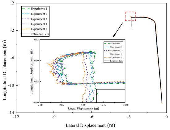 The experimental path for the heavy-duty forklift AGV included straight sections, curved turns, and loading/unloading paths. Figure 9 shows the actual movement paths obtained from five experiments. In the experimental scenario, obstacles restricted the movement channels, leading to a slight inclination in the planned straight sections to prevent collisions. The heavy-duty forklift AGV started from the bottom right corner of the path shown in Figure 9, first traveling along a long straight section. It then performed a turning maneuver at the curved section in the top right corner. Next, it moved from right to left along a shorter straight segment toward the target location, where it executed the loading/unloading operation at the top left corner.