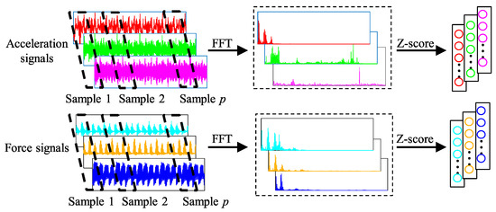 As shown in Figure 1, for the acquired multi-sensor signals, firstly, the one-dimensional time series of length m × 1 is divided into p segments using sliding window segmentation, and each time series is processed by FFT to obtain a one-dimensional frequency-domain series of length l × 1. Secondly, in order to eliminate the influence of dimensions between parameters and improve the efficiency of model training, the data are standardized using the Z-score method, as shown in Equation (6).