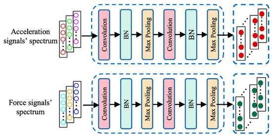 Finally, the frequency-domain sequences of the three channels of acceleration and cutting force signals are fused into the acceleration signal eigenvector and the force signal eigenvector of length , which are denoted as and , respectively, and serve as the input to the deep-learning network.