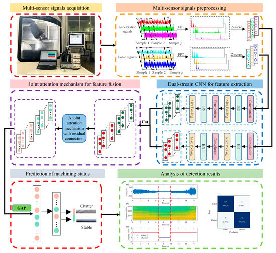 In this study, a multi-sensor fusion method for chatter detection in the thin-wall milling process is proposed. The method is mainly composed of four parts: preprocessing of multi-sensor signals, feature extraction using a dual-stream CNN with processed multi-sensor signals, fusion of sensor features through a joint attention mechanism based on residual connection, and prediction of machining states.