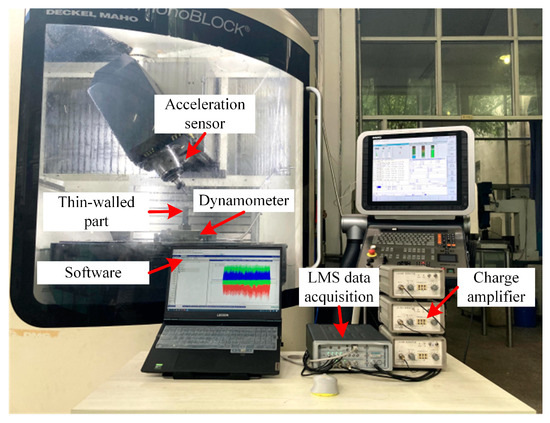 To validate the effectiveness of the proposed chatter detection method, machining experiments are conducted on a five-axis CNC milling machine DMU 60 Monoblock, as depicted in Figure 5. The test workpiece is a thin-walled TC4 titanium alloy part with geometric dimensions of 100 mm × 100 mm × 6 mm. The experimental tool is a 10 mm diameter variable pitch ball-end cutter with an axial cutting edge length of 18 mm, a helix angle of 30°, and alternating pitch angles of 85°-95°-85°-95°. To enrich the cutting status information during machining, multiple sensors are utilized for chatter detection. Vibrations generated during milling are measured by a three-dimensional accelerometer mounted on the spindle head, while cutting forces are monitored using a YDCB-III05 dynamometer attached to the turntable. At the same time, the LMS SCADAS data acquisition system is employed to simultaneously acquire acceleration and cutting force signals at a sampling frequency of 20 kHz.
