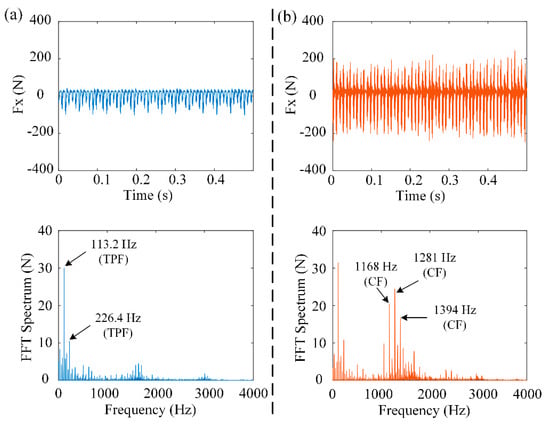Time and frequency domains of cutting force signals under different machining status: (a) stable and (b) chatter. Symbol ‘CF’ means the chatter frequency.