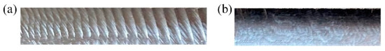 Chatter recognition using deep learning is framed as a classification problem, typically tackled with supervised learning methods. The quality of the dataset greatly influences the performance of the chatter detection method. In this study, the machining states are classified as either stable or chatter. By thoroughly analyzing the time- and frequency-domain features of the cutting force signal, accurate labeling of data is achieved. As illustrated in Figure 6, chatter in the machining state results in a significant increase in signal amplitude in the time domain and a shift in the dominant frequency band in the frequency domain. Conversely, in a stable state, the signal frequencies in the frequency domain are primarily the tooth pass frequency (TPF) and its multiples. Additionally, the machined surface of the thin-walled workpiece is inspected after each milling. Figure 7 shows that during stable milling, the surface is smooth; however, chatter causes a marked reduction in surface finish and the appearance of visible chatter marks.