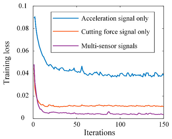 To verify the classification performance of the proposed chatter detection method, it is compared with a chatter detection method based on a single sensor and evaluated from the perspectives of training loss, confusion matrix, and feature visualization. It should be noted that the chatter recognition method based on a single sensor is also based on deep learning but only uses a single-stream CNN and does not consider the attention mechanism with residual connection.