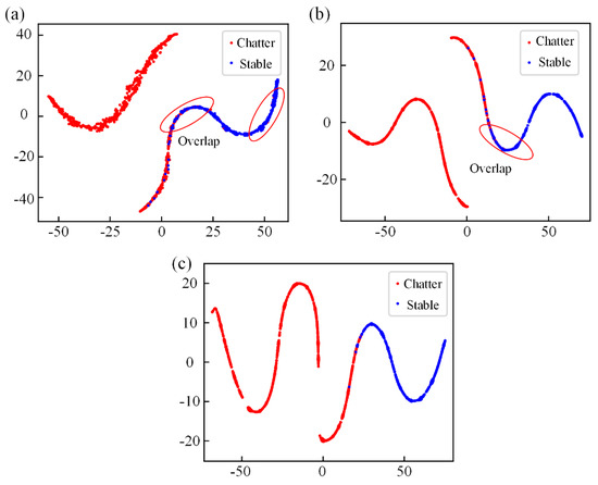 To visualize and analyze the learning features of the network, t-SNE technology is utilized to map the feature distribution in the fully connected layer at the network’s termination. Generally, t-SNE is employed to assess the efficacy of fault diagnosis methods by projecting high-dimensional features into a two-dimensional space. The outcomes of the t-SNE visualization are presented in Figure 10, where each point’s coordinates denote its position in the 2D space. As depicted in Figure 10, when the chatter detection method utilizes only the acceleration signal or the cutting force signal, the features in the final fully connected layer exhibit varying degrees of overlap. In contrast, the clustering results of the proposed method are notably distinct, with minimal overlap observed. This suggests that the proposed method effectively discerns diverse features and identifies distinct machining states.