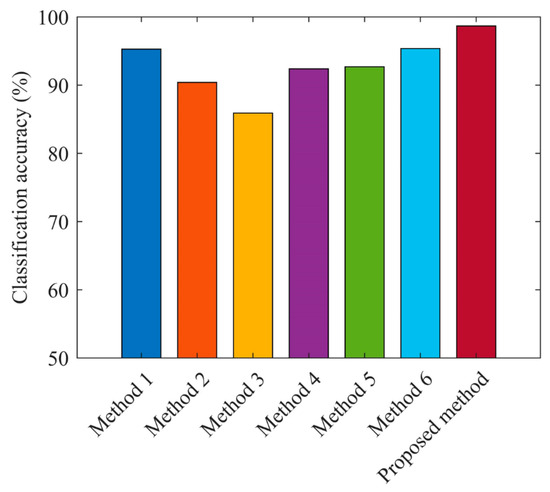As can be seen from Figure 11, the proposed method is better than Method 1 in terms of classification accuracy. Combined with the results in Table 3, it can be found that the accuracy of the chatter identification method based on the cutting force signal is also higher than that of Method 1. This indicates that there is redundancy in the features of the multi-sensor signals and verifies the necessity of adaptive fusion features using the attention mechanism with residual connection. Compared with Method 6, the proposed method is improved by 3.31%, which shows the validity of using the FFT of signals as the input for the deep-learning network model. Compared with other shallow intelligent chatter identification methods, the accuracy of the proposed method increases by up to 12.78% and at least 5.98%.