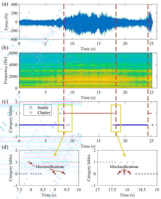 Chatter detection results for thin-walled part using the proposed method (spindle speed: 1200 rpm, depth of cut: 0.3 mm, lead angle 10°). (a) y-direction force signal; (b) time–frequency spectrogram via short-time Fourier transform; (c) machining state classification result; and (d) misclassifications.