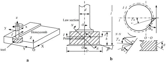 Conventional Nomex honeycomb composite structure processing system: (a) geometric characteristics of the milling tool; (b) milling process [71].