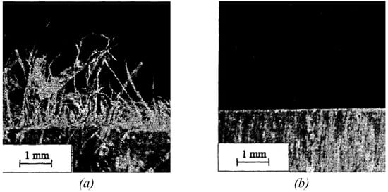 Quality of the machined surface: (a) uncut fibers, machined with diamond tool; (b) clean surface machined with a laser [79].