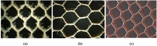 Correlation between the quality of the machined surface and the defect observed at the adhesive strip of the honeycomb structure assembly [88]: (a) poor surface quality containing uncut fibers; (b) poor surface quality containing delamination of the double walls and uncut fibers; (c) better surface quality.