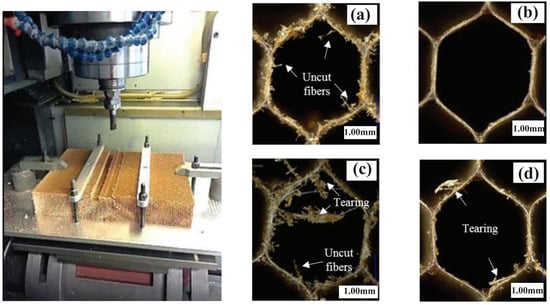 Researchers have examined various aspects of conventional computer numerical control machining of Nomex honeycomb structures. Many researchers have focused their efforts on the machining of honeycomb structure parts, analyzing conventional and unconventional manufacturing processes in detail. These studies involved a careful selection of different conventional cutting tools suitable for machining components made from materials such as carbon-fiber-reinforced plastic and aramid-fiber-reinforced plastic [89,90,91,92]. Jaafar et al. [93] focused his research on the high-speed conventional milling of Nomex honeycomb composite structures, emphasizing the optimization of cutting conditions. In the same context, Figure 7 presents the experimental setup of conventional milling and its effects on the machined surface quality of Nomex honeycomb structures, depending on various machining parameters. To analyze the cutting force involved in this process, Qiu [62] developed a cutting force model and performed simulations under various machining conditions to predict the force exerted on a single cell wall. The results demonstrated that the entry angle plays a crucial role in the formation of these cutting defects. Notably, cutting forces including burrs and overcuts are mainly observed at entry angles of 80° and 170°. Additionally, increased cutting force is observed when the entry angle exceeds 75°.