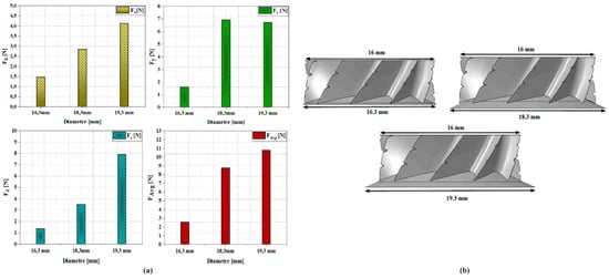 The results in Figure 8 indicate that the machining forces are closely related to the gap between the cutting tool elements. The increase in the diameter difference leads to an increase in the feed component Fx due to the accumulation of material on the tool face, resulting in increased resistance. The crushing component Fz increases steadily with the variation in the diameters, due to the strong contact between the tool and the honeycomb structure. As for the cutting component Fy, it varies non-linearly depending on the diameter difference, attributable to the restoring force of the Nomex paper walls, influencing chip formation. Thus, the management of this gap is crucial to improve the durability of the cutting tool and optimize the machining process.