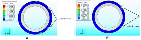 Adhesive wear on the clearance surface of the cutting tool for different cutting conditions [94]: (a) 23,000 rpm, 2000 mm/min; (b) 23,000 rpm, 200 mm/min.