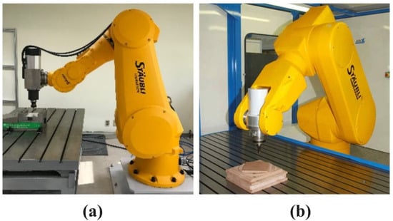 The rise of industrial robots in manufacturing reflects a shift in production methods from mass production to mass customization. Robotic machining has the advantage of high flexibility compared to conventional machine tools, allowing robots to perform various machining processes by simply adjusting their tools or end effectors. This adaptability enhances the agility of companies and their ability to respond effectively to changing market demands. In addition, robots offer notable advantages, such as a large workspace, great freedom of movement and the ability to be deployed in mobile environments, all at a lower cost [180,181,182]. Robotic processing systems are generally structured in two ways: either with a serial manipulator or by attaching a spindle to the robot’s end effector. To meet the needs of a three-dimensional machining process, a spindle can be mounted on the fifth joint of the manipulator robot, thus avoiding the complexity associated with the sixth joint and reducing the impact of external forces on the process. This configuration is illustrated in Figure 14.