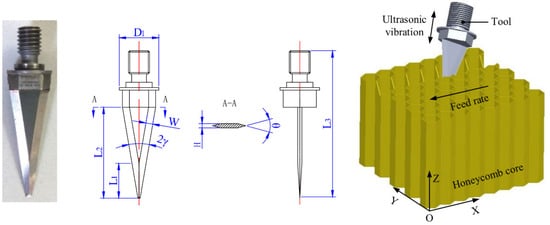 The amplitude and resonance frequency of ultrasonic vibrations play a crucial role in processing systems using straight blades. When designing these tools, it is essential to select and optimize all parameters, considering these variables. An experimental study by Wang [183] investigated the impact of cutting conditions on surface quality and cutting force, revealing that the tool tilt angle and vibration amplitude influence these criteria. Meanwhile, in a complementary approach, Xiang [184] analyzed the surface defects resulting from the straight-knife cutting direction variations in conjunction with ultrasonic vibrations. In addition, Kang [185] developed a theoretical model to evaluate the cutting force during the straight-knife machining of the Nomex honeycomb composite core, highlighting the influence of processing parameters and tool design on the cutting force and surface quality. Cutting force is the stress exerted on the cutting edges of straight-blade cutting tools during the machining of Nomex honeycomb composite structures, representing the material removal resistance. Its analysis is crucial to validate and optimize the design parameters of ultrasonic straight-blade cutting tools, as well as the associated processing variables. This analysis is based on various methods such as mathematical modeling, finite element simulations and empirical experiments. The efficiency, cutting force, and surface quality of workpieces in ultrasonic straight-blade cutting systems are significantly impacted by their design parameters. Straight-blade cutting tools for Nomex honeycomb composite structures are typically developed based on the resonance principle, ensuring optimal performance. High-speed steel (HSS-W18Cr4V) is a common option for such cutting tools. Figure 16 illustrates the design features of the straight-blade cutting tool and the schematic of the machining process.