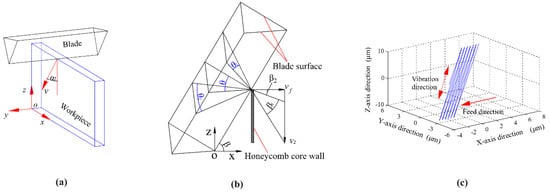 To fully comprehend the cutting mechanism associated with straight-blade cutting, it is crucial to examine the cutting tool displacement and speed, which are determining factors in the machining process of honeycomb composites with this technology. The displacement and velocity parameters of straight-blade cutting tools can be defined using various notations such as A for the ultrasonic longitudinal vibration amplitude, vf for the feed rate, β for the tilt angle, α for the defective angle, f for the ultrasonic vibration frequency, t for time and Sx, Sy, Sz, Sx, Sy and vz for the tool displacements and velocities along different axes. The relevant equations have been documented in the literature [179,184,186].