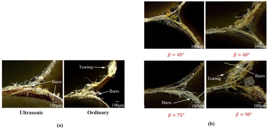 Figure 18 shows an ultrasonic-vibration-assisted machining setup, where the Nomex honeycomb composite core is fixed to the base of the fixture using double-sided tape and securely anchored to the machine table. A Kistler force gauge, positioned between the machine table and the workpiece, is used to measure the cutting force. During ultrasonic longitudinal vibration processing, the periodic interaction between the cutting tool and the workpiece generates impacts that promote the formation of microcracks in the material. The machining of Nomex honeycomb composites with straight or triangular blade cutting tools does not require any rotational motion. Furthermore, ultrasonic machining and conventional processes can be alternated simply by switching the ultrasonic power of the generator on or off, thus using the same experimental setup. In this context, the experimental results highlight that the ultrasonic longitudinal vibration-assisted processing produces a superior surface quality compared to the conventional process, under identical processing parameter conditions (Figure 19a). Furthermore, a gradual increase in the burr rate and tearing of the machined surface is observed with the increase in the inclination angle during the ultrasonic-vibration-assisted cutting of the Nomex honeycomb composite structure (Figure 19b). The study by Ma et al. [27] provided strong evidence for the effectiveness of ultrasonic processing in reducing cutting force and improving surface quality compared with conventional methods. In addition, the results of the mathematical model were consistent with the experimental data, thus strengthening the reliability of the approach used. So far, the literature on the processing of straight blades of Nomex honeycomb composite structures assisted by ultrasonic longitudinal vibration remains limited. A few works have addressed this topic from various angles, including cutting force models, finite element (FE) simulations, cutting tool design, processing parameter optimization, kinematic analyses and fracture mechanics theory [183,184,185,186,187,188,189,190,191].