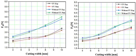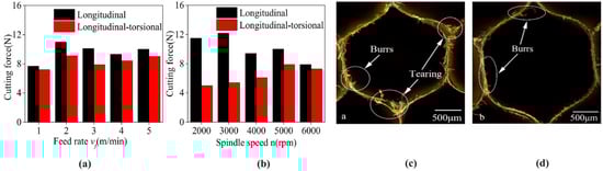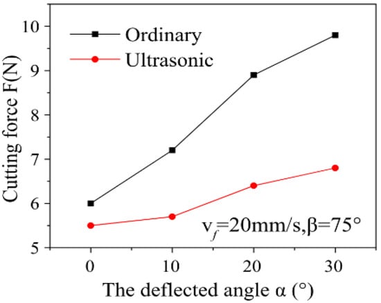 In their study, Xiang et al. [184] observed a negative correlation between cutting force and both vibration amplitude and tool tilt angle. On the other hand, a positive correlation was noted between cutting force, deflection angle and feed rate. Ultrasonic cutting tests conducted by Xiang demonstrated that this technique reduces the cutting force compared to the traditional method (see Figure 20). Furthermore, Ma et al. [27] developed a mini ultrasonic cutting system and modeled it mathematically. Their in-depth analysis revealed that the use of ultrasound decreased the cutting force and improved the surface quality compared with conventional methods. The experimental results were found to be consistent with the predictions of the mathematical model, thus validating the effectiveness of the ultrasonic method.
