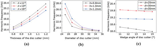 The study conducted by Xu et al. [190] focused on the analysis of the structure of a disc cutter. Its main objective was to determine the optimal parameters that influence the performance of the disc cutter, including its diameter (d), the cutting angle (θ) and the thickness of the disc (h) (Figure 22). To do this, a single-factor modal simulation was proposed, a method allowing us to understand the impact of each parameter in isolation on the dynamic properties of the disc, such as its natural vibration frequency and its response to mechanical stresses. Optimizing these parameters is of critical importance to maximize cutting efficiency while minimizing wear and harmful vibrations, contributing to the better durability and performance of the cutting system.