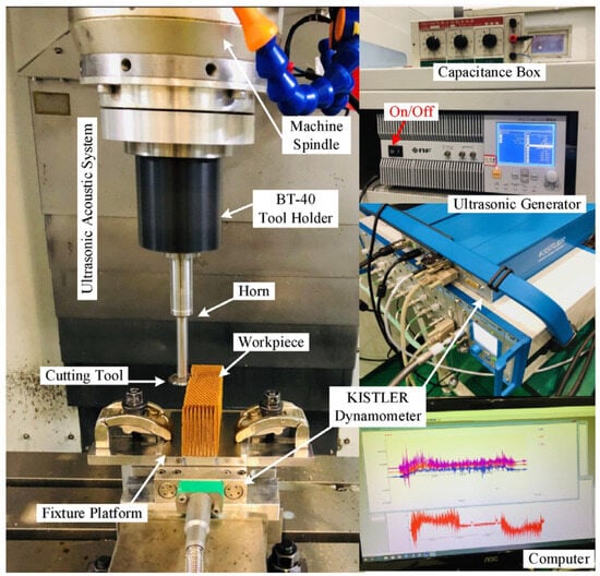 The assessment of the influence of the design parameters of the straight knife processing system, including aspects such as tool thickness, tool tilt angle, tool length, and tool material, as well as processing variables such as ultrasonic longitudinal vibration amplitude, tool tilt angle, cutting depth and width and feed rate, on the cutting performance and machined surface quality, is commonly carried out using analytical approaches, finite element simulations and experimental tests. Usually, the practical organization for carrying out the experimental process of processing straight Nomex honeycomb composite blades with the assistance of ultrasonic longitudinal vibration includes several components, including an ultrasonic acoustic system, a multi-axis numerical control machine tool, a dynamometer for measuring cutting force, a data acquisition device, an ultrasonic generator, a power transfer mechanism and various necessary accessories. These components are presented in detail in Figure 18.