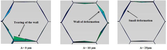 The results in Figure 9 show that the chip size when milling Nomex honeycomb composite structures is strongly related to the gap between the cutting blade and the cutter. The chip formation process is divided into two stages: first, the blade cuts the thin walls, and then the cut walls are pushed back by the cutter. A small gap promotes the formation of small chips, while a large gap generates larger chips. Thus, the gap between the two elements of the cutting tool significantly influences the chip size. Large chips are undesirable because they lead to premature wear of the tool. Therefore, it is crucial to consider this deviation when milling Nomex honeycomb composite structures to optimize the machining process. In the same context, Zarrouk et al. investigated the influence of feed rate on the premature sticking wear of the cutting tool based on a numerical model for milling Nomex honeycomb structures. This analysis was carried out by comparing the results of the numerical model through a visual examination, as illustrated in Figure 10.