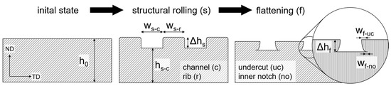 Few processes efficiently utilize forming processes for interlocking large areas. Channel structures with undercuts can be produced in a multi-pass cold rolling process along a continuous line, making it an efficient method to prepare expansive surface areas [15]. In the initial pass, a structural roller with machined channels imprints a rectangular structure of channels and ribs into the surface of a steel sheet (Figure 1). Previous studies used sheets of initial height and created deep channels [15]. The sheet height at the channels is determined by the height reduction and the rib and channel width by the roller geometry. In the subsequent pass, the structure is flattened via flat rolling to a depth . The tips of the ribs spread horizontally and form an undercut of up to width [16]. As the undercut develops, the vertical side of the rib can fold over the channel bottom, creating an inner notch of length [17]. This notch can be prone to cracking and is therefore unwanted, but not always avoidable. The structured sheet material is then inserted in a hybrid casting or molding process. The liquid material, e.g., aluminum melt, fills the undercut channels and interlocks once solidified [18]. In previous studies, a high-pressure die casting (HPDC) process was developed by the Foundry Institute (GI) of RWTH Aachen University [19]. Shear tests on flat, hybrid-casted samples have shown a maximum joint strength of 45 MPa. This strength depends on the geometry, especially the undercut width, of the structure [16].