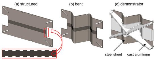 To investigate the concept close to the automotive industry level, a more complicated geometry of the multi-material component was designed based on a section of a roof cross beam (Figure 2c). This demonstrator part, with aluminum surrounding the steel insert, requires interlocking surface structures on both sides of the insert (Figure 2a) and a bending of the surface structure (Figure 2b). The effects of bending were investigated in a prior study and are not expected to have a critical influence on the orientation used in this investigation [20].