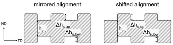 The simulations show a similar trend for the development of the forces. At 20% height reduction, the simulations overestimate the mirrored alignment by approx. 3.5% and the shifted alignment by approx. 14.7%. When comparing both alignments, a reduced force for the shifted alignment is observed in general. As an example, the experimental force at 20% height reduction is 24.1% smaller for the shifted alignment. One reason might be the material flow as shown in Figure 7. For the mirrored alignment, the material needs to flow laterally first and then vertically into the ribs. The shearing of the material in the shifted alignment might require less rolling force.