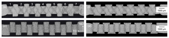 The rolling was conducted on a roll-forming machine P3.160 by the company Dreistern GmbH & Co. KG (Schopfheim, Germany). Sheets of 200 mm width and 245 mm length were used for the validation of the structuring pass. For the flattening pass sheets of 160 mm width and 500 mm length were used. To achieve a straight channel structure and transfer the material in between the rolling stands, lateral guide rails were installed. Profiled rollers with 92.5 mm radius and 13 mm width were used for the first pass. The profiles consisted of seven ribs and six channels, each 1.0 mm wide and 0.5 mm deep. A fillet radius was milled at the rib edges with a size of 0.1 mm for the upper and 0.05 mm for the lower roller. A flat roller pair with a 93.0 mm radius and a 50 mm width was used for the consecutive flattening pass. The rolling speed was set to 5.8 m/min. The rolling force was measured by load cells. Despite the guide rails, a light curvature was observed and removed by roller leveling. Two samples of each sheet were extracted for cross-section preparation by water jet cutting. The resulting structure geometry was measured by a Keyence VHX-7000 digital microscope (Osaka, Japan). To make the inner notch and material flow visible, a 3% Nital etching was used for approx. 60 s. Exemplary cross-section pictures of the structural rolling and flattening pass as well as of the mirrored and shifted alignments are shown in Figure 5. Since the channels at the sides (nos. 1, 2, 6, 7) show significant deviations in shape, only the middle channels (no. 3 to 5) were used for evaluation and validation of the simulations.