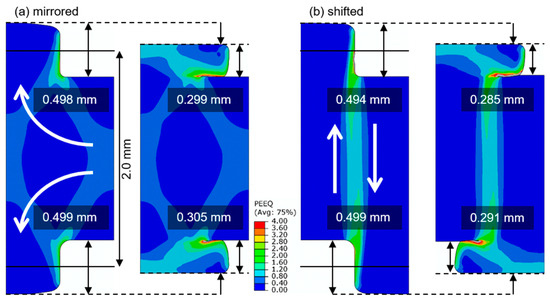 Figure 6 shows the exemplary material flow in the simulations for the structural rolling and flattening. Both alignments show channel depths of approx. 0.5 mm after the channel rolling. During the flattening, the channel depths are reduced to approx. 0.3 mm and the undercut and inner notch are clearly visible. However, the strain distribution in the two setups is very different, suggesting different material flow. It seems likely that the material flow in the mirrored alignment comes from the channel section and flows laterally and then vertically into the ribs (see white arrows). The shifted alignment shows a vertical high-strain area at the intersection between the channels and ribs. This indicates that the material is sheared in this region (see white arrows).
