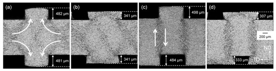 The material flow, which was suggested by the simulations, was also found in the experiments. Figure 7 shows close-ups of the cross-sections after structural rolling and flattening. The Nital etching makes the material flow direction visible.