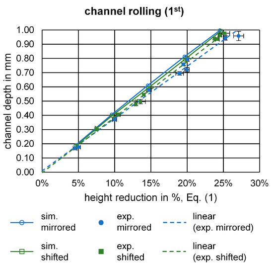 For the channel rolling, the channel depth is displayed over the height reduction for simulations and experiments in Figure 8. The plane strain simulations reach a channel depth of 1.0 mm, thus 0.5 mm for both the upper and lower channel, at a height reduction of approx. 25%, as expected. Previous studies for single-sided structures showed that the slope of the experimentally measured channel depth was only 65% as big [17]. Surprisingly, for the double-sided structures, the slope of the experimental values is much closer to the simulations. Here, a channel depth of 1.0 mm is possible with approx. a 27% height reduction for the mirrored alignment and 26% height reduction for the shifted alignment.