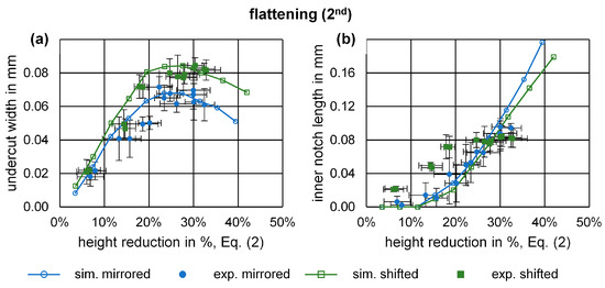 For the flattening pass, the values of the undercut width from simulations and experiments fit well (Figure 9a). The undercut maximum is reached at around 25% height reduction and is decreasing thereafter. The shifted alignment results in increased undercut widths. The maximum undercut width of the shifted alignment is in the simulations approx. 24% bigger compared to the mirrored alignment. The inner notch (Figure 9b) starts to form at approx. 12% height reduction in the simulations and is then steadily increasing. The development of the inner notch for the shifted alignment seems to be slightly smaller. The experimental values for the mirrored alignment align well with the simulation, while the simulations of the shifted alignment underestimate the inner notch for smaller height reductions.