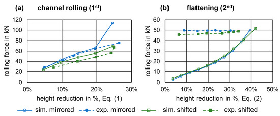 Apart from the geometry, the rolling force was also analyzed. In the channel rolling experiments, increasing rolling forces with increasing height reductions were observed (Figure 10a). To be able to compare the rolling forces from the 2D simulation, a transformation is necessary. The maximum force from the simulation is multiplied by the contact length and the contact width (Equation (6)).