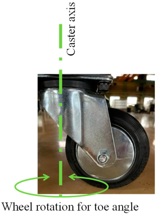 Figure 1 shows a senior car that is turned using a handlebar. The rear wheels are the drive wheels, and the power from a drive motor is sent to a differential, which distributes power to the left and right wheels. The front wheels are the driven wheels, and the toe angle of the front wheels is controlled by a handlebar, allowing the vehicle to turn with the same feeling as steering a car or motorcycle. Figure 2 and Figure 3 show a joystick-type electric wheelchair, which is equipped with two drive motors on the left and right, and turns by operating the joystick to create a difference in the rotation speed of the left and right drive motors. The driven wheels are required to roll in a direction tangential to the turning circle, determined by the difference in rotational speed between the left and right driving wheels. This is accomplished by using omniwheels [14] or casters, as shown in Figure 4 and Figure 5. Omniwheels can rotate not only perpendicular to the wheel axis, like normal wheels, but also in the direction of the wheel axis. There are many small wheels that rotate around an axis perpendicular to the wheel axis and which can roll in any direction.