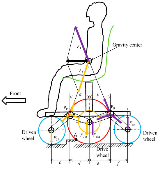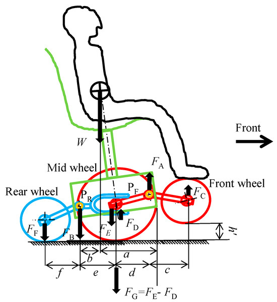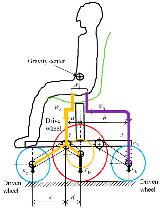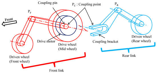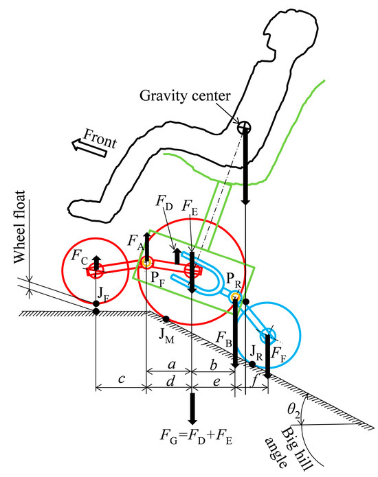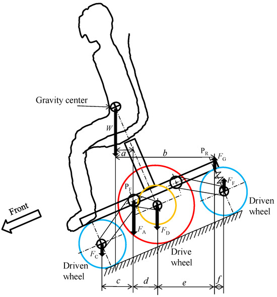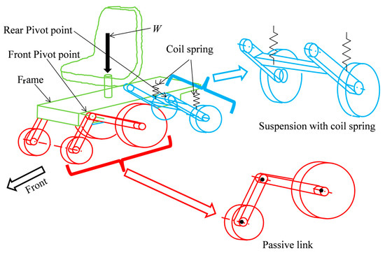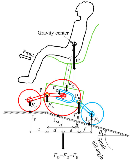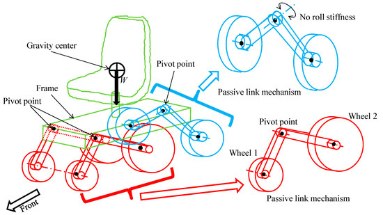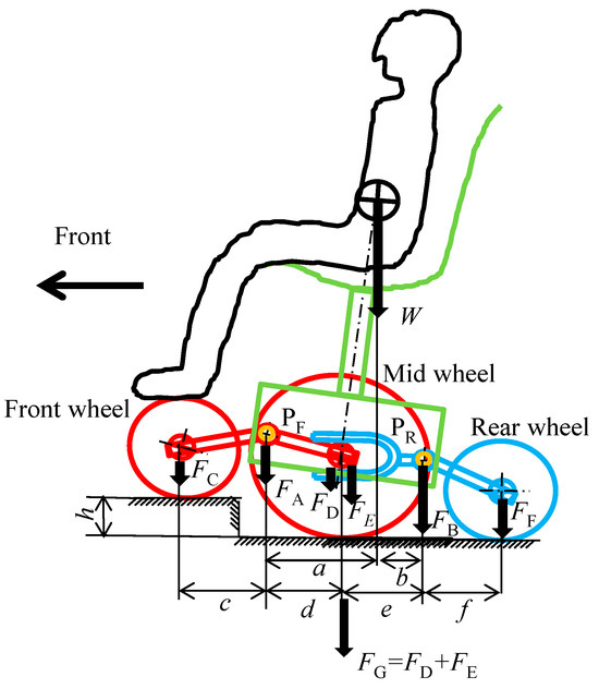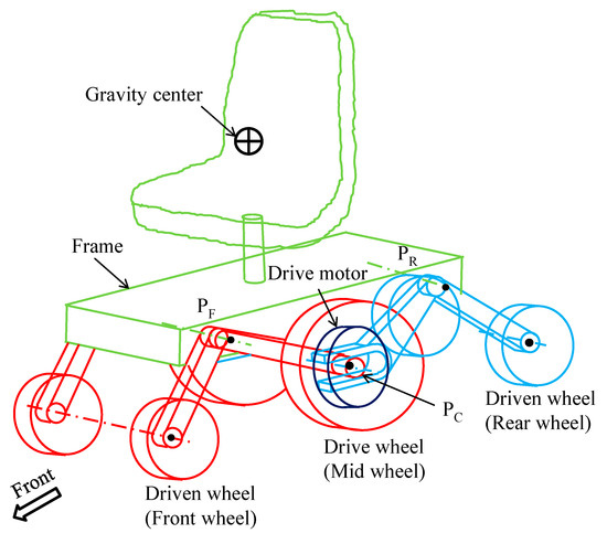 This chapter describes a joystick-type six-wheel electric wheelchair with an improved chassis that is currently being developed for commercialization. It has been designed with the goal of having high resistance to tipping and a high ability to overcome obstacles. Please note that the improved chassis is currently under patent application [15,16] with the assumption of commercialization, and the text provides only a qualitative description of its structure and operation and does not provide specific numerical values. Figure 11 shows the complete wheelchair and Figure 12 shows the details of the suspension system. Figure 13 shows the weight distribution of each link from a side view. Next, the mechanism of this suspension system is explained. The front wheels, which are the driven wheels, and the middle wheel, which is the driving wheel, are attached to the front rocker, shown in red. The rear wheels, which are the driven wheels, are attached to the rear rocker, shown in blue. The front and rear rocker arms are connected to share the center wheel. The structure of the link is connected to the center wheel at the PC connection point, and only vertical displacement can be transmitted between them. The vertical displacement of the PC joint is transmitted by the rotating roller on the front link (red) and the U-shaped bracket on the rear link (blue). The roller is embedded in the U-shaped bracket and transmits the vertical displacement of the vehicle to each end. The relative movement of the roller and the U-bracket caused by the vertical movement of the wheel is absorbed by the roller rolling inside the U-bracket. A small gap is provided in the roller diameter and the inner width of the U-bracket to allow the roller to roll easily. The front rocker arm and the rear rocker arm are fixed to the vehicle frame so that they rotate only at the PF and PR pivots. By connecting the two front and rear rocker arms with a roller in the middle, it is possible to rotate the load of the aforementioned PR pivot point to the center wheel. In this way, it is possible to make the dimensions a and b equal and to increase their values.
