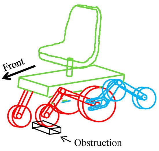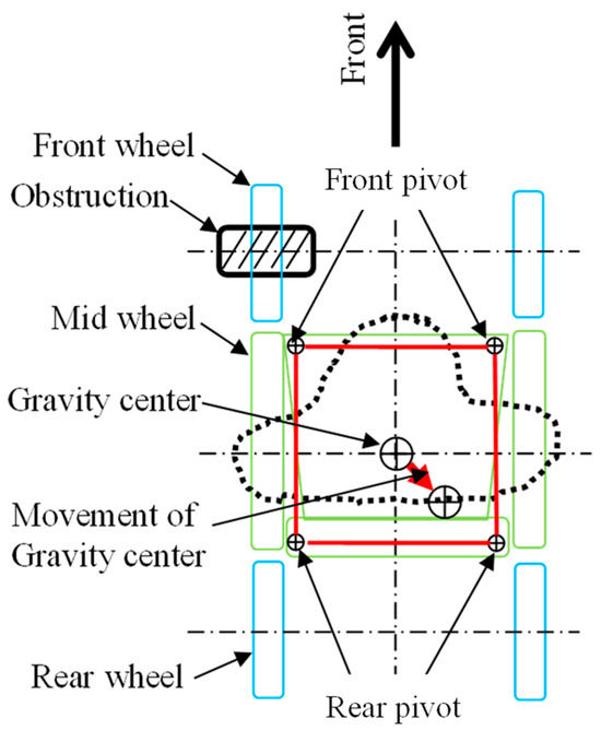 In this section, we will explain wheel load distribution on uneven ground for the improved suspension system. We assume that the left front wheel, which is the drive wheel, drives over a curb as shown in Figure 14. We also assume that the height of the obstacle is such that the center of gravity shift caused by the overrun falls within the red lines formed by the points of the front and rear four-link suspensions in the top view of Figure 15.