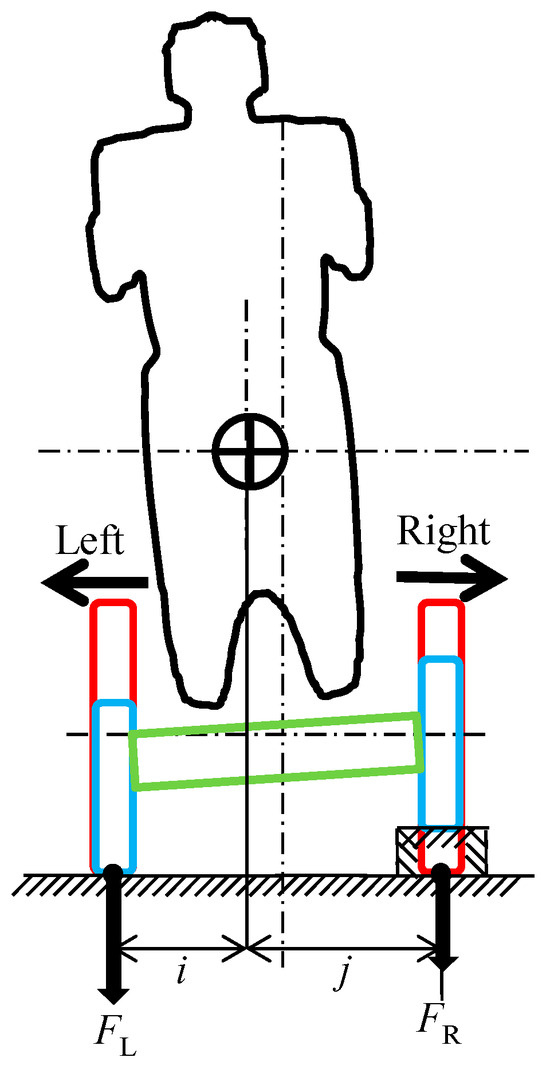 Figure 16, Figure 17 and Figure 18 show the wheel loads when driving over a curb, as shown in Figure 14 and Figure 15. Figure 16 shows the wheel load distribution on the left side, where the curb is located. A downward load is generated on each wheel, as shown, and the wheels are secured in contact with the ground. Figure 17 shows the load distribution on the left and right wheels from the front of the wheelchair. As can be seen, the load is transferred to the wheel on the side without the curb. Figure 18 shows the wheel load distribution on the side without the curb, i.e., the right side. In this case, the upward displacement of the front pivot point FP that occurs on the left side lifts the right pivot point FP. This creates an upward force FA on the right pivot FP. If this force is greater than the initial front wheel load, the front wheels will lose contact with the ground. However, as shown in the figure, since the center of gravity is between the center and rear wheels, the center and rear wheels remain in contact with the ground and stable running is possible.