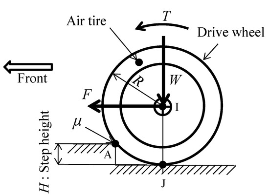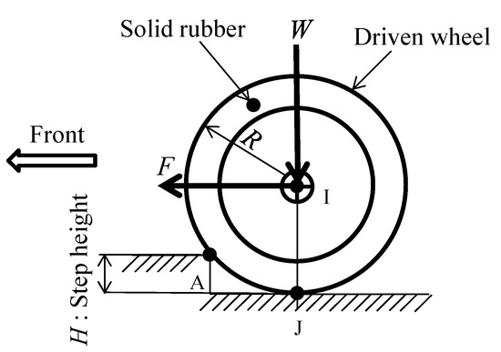 First, the mechanism by which the driven wheel passes over a curb will be explained. Figure 21 shows a diagram of the driven wheel encountering a curb. The symbols in the diagram will be explained. The radius of the driven wheel is R, and the curb-climbing height is H. The forward thrust applied to the driven wheel is F, and the wheel load of the driven wheel is W. Point I indicates the wheel center, point J indicates the contact point between the ground and the wheel, and point A indicates the contact point between the curb and the wheel. Please note that the thrust F mentioned here is not only the driving force of the motor, but also includes the inertial force generated when the wheelchair encounters the curb. Furthermore, the wheel load of the driven wheel W includes not only the static front wheel load of the electric wheelchair, but also the inertial force generated by the wheelchair. Note that the driven wheel is made of hard solid rubber, so it is assumed that it does not deform.